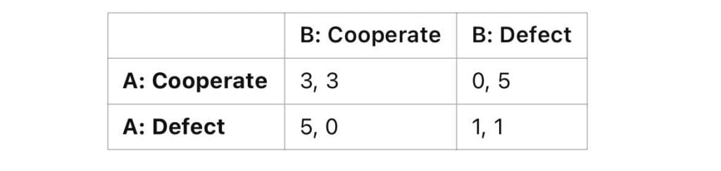 This is the classic Prisoner’s Dilemma, where the Nash equilibrium is both players defecting (even though cooperation would be better for both).