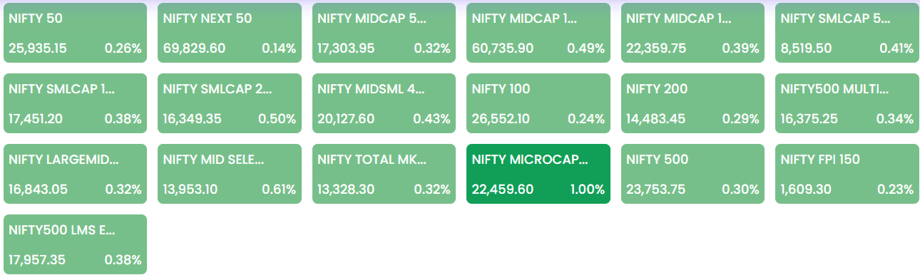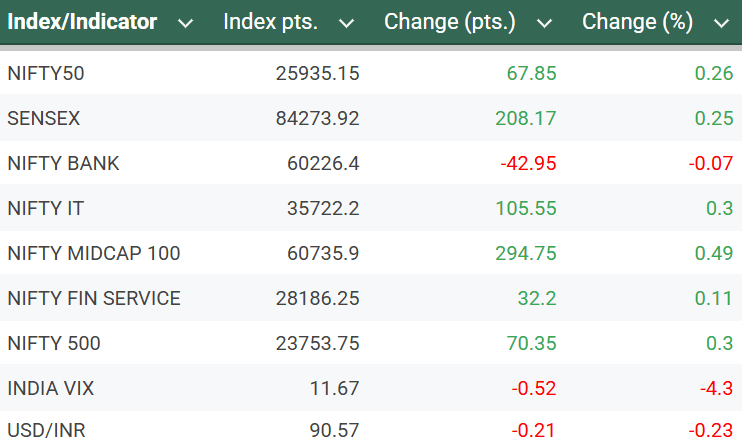 At close on Tuesday, the Sensex was up 208.17 points or 0.25 percent at 84,273.92, and the Nifty was up 67.85 points or 0.26 percent at 25,935.15. During the session, the 30-share BSE Sensex jumped 417.2 points (~0.49%) to hit an intraday high of 84482.95 while the 50-share NSE Nifty also appreciated 122.15 points to hit a high of 25989.45 before investors booked profits later in the session.