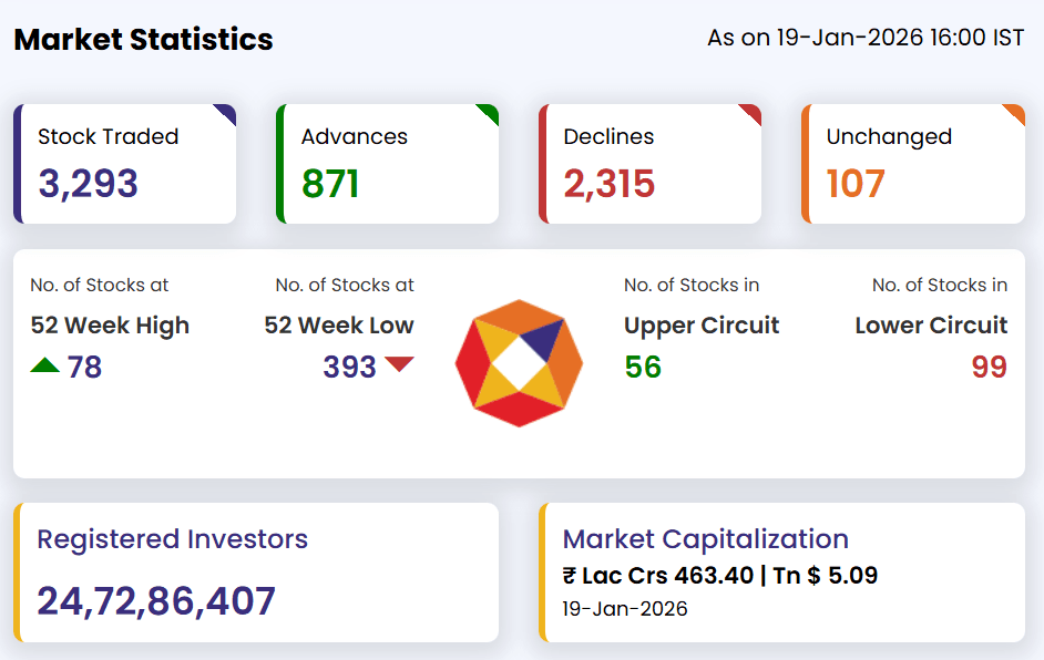 The Sensex settled 324.17 points or 0.39 percent lower at 83,246.18, while the broader Nifty declined to 25,585.50, down 108.85 points or 0.42 percent amid rising global uncertainty and weak Q3 domestic results weighing on investor sentiment. According to Moneycontrol, With markets hitting newer lows of the new year, value buying emerged on January 19 with indices trading comfortably above day’s low.