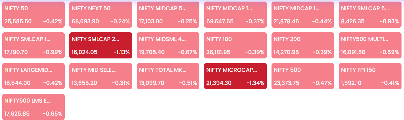 All the broader indices closed in the red, with the Nifty Small-cap index down around 1%. Both small-cap 50 and small-cap 100 declined due to 4% decline in shares of Aster DM Healthcare. The BSE Small-cap meanwhile fell 1.3% while the Midcap closed 0.4% lower.