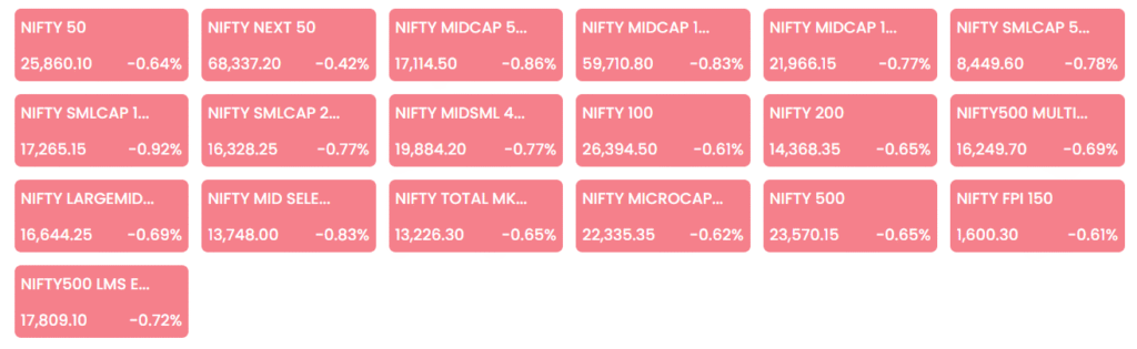 Today’s trading session was marked by a broad-based risk-off mood as investors reacted to a mix of weak global cues, domestic macro headwinds, and looming key U.S. economic data. On Dalal Street, the Indian equity benchmarks ended firmly in the red — the BSE Sensex slid about 533 points, closing around 84,680, while the NSE Nifty50 finished near 25,860, down more than 0.6 % on the day.