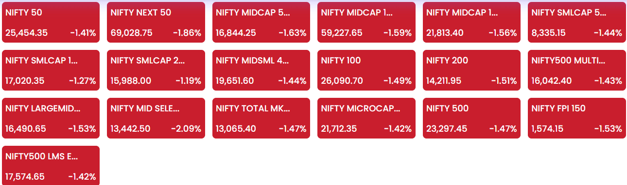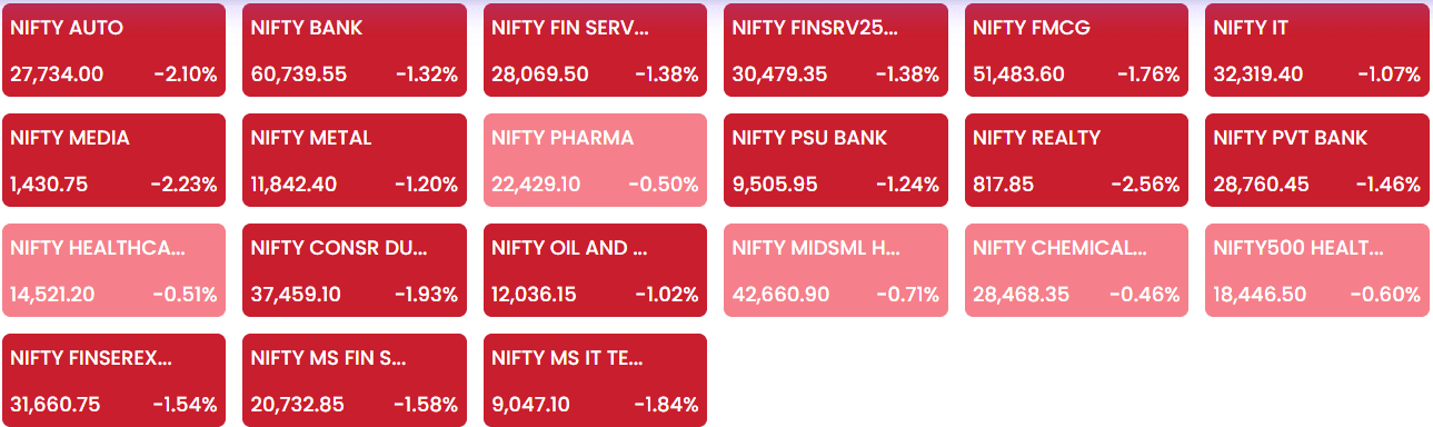 The broader indices mirrored the performance of the benchmark indices, with the Nifty Midcap index declining 1.6 percent and the Nifty Smallcap index falling 1.3 percent.