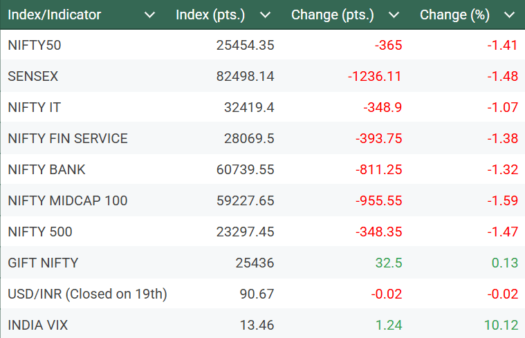 At close on Thursday, the Sensex was down 1,236.11 points or 1.48 percent at 82,498.14, and the Nifty was down 365 points or 1.41 percent at 25,454.35.