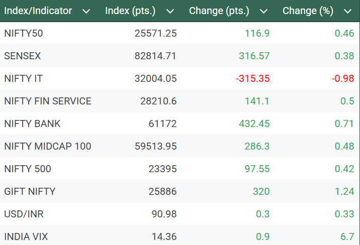 While on Friday, the Sensex was up 316.57 points or 0.38 percent at 82,814.71, and the Nifty was up 116.90 points or 0.46 percent at 25,571.25 at close.