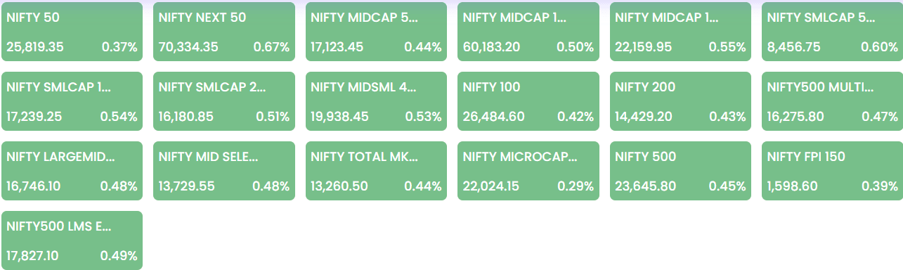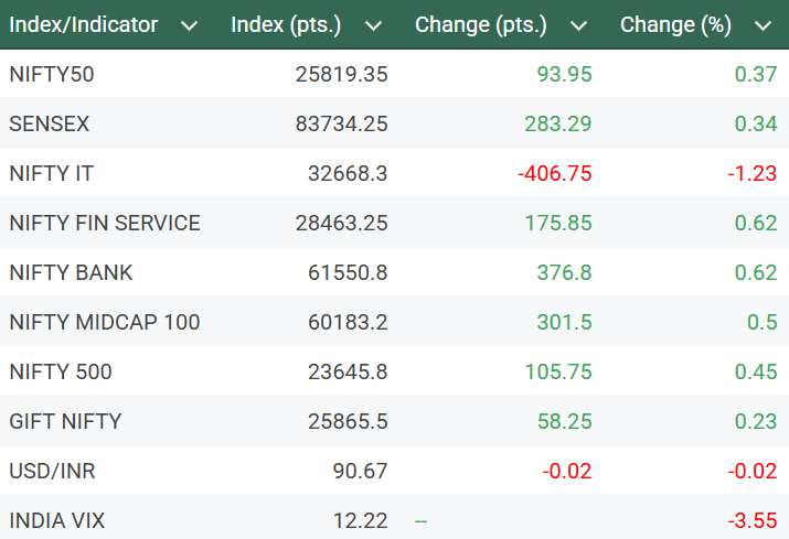 At close, the Sensex was up 283.29 points or 0.34 percent at 83,734.25, and the Nifty was up 93.95 points or 0.37 percent at 25,819.35.