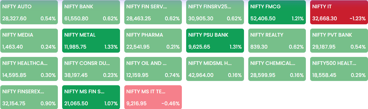 On the sectoral front, all the major indices ended in green except the IT sector, with metal, FMCG, PSU Bank indices up 1% each, while Private Bank, realty, auto, oil & gas up 0.5% each. The IT index, meanwhile, slipped ~1.2% and ended in red.